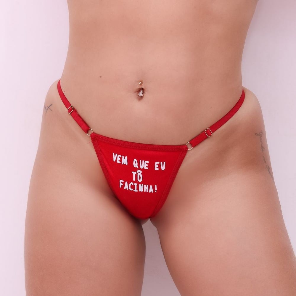 A Calcinha Fetiche da Tallyta Moda Apimentada é um modelo fio dental com frases ousadas para que você seduza e deixe seu amor babando de tesão.🤤 É fabricada com matéria prima de ótima qualidade e conta com regulagem lateral. Possui estampada na parte frontal a frase: ”VEM QUE EU TÔ FACINHA” e acompanha ainda uma linda gargantilha na cor da calcinha com um pingente decorativo.😈
