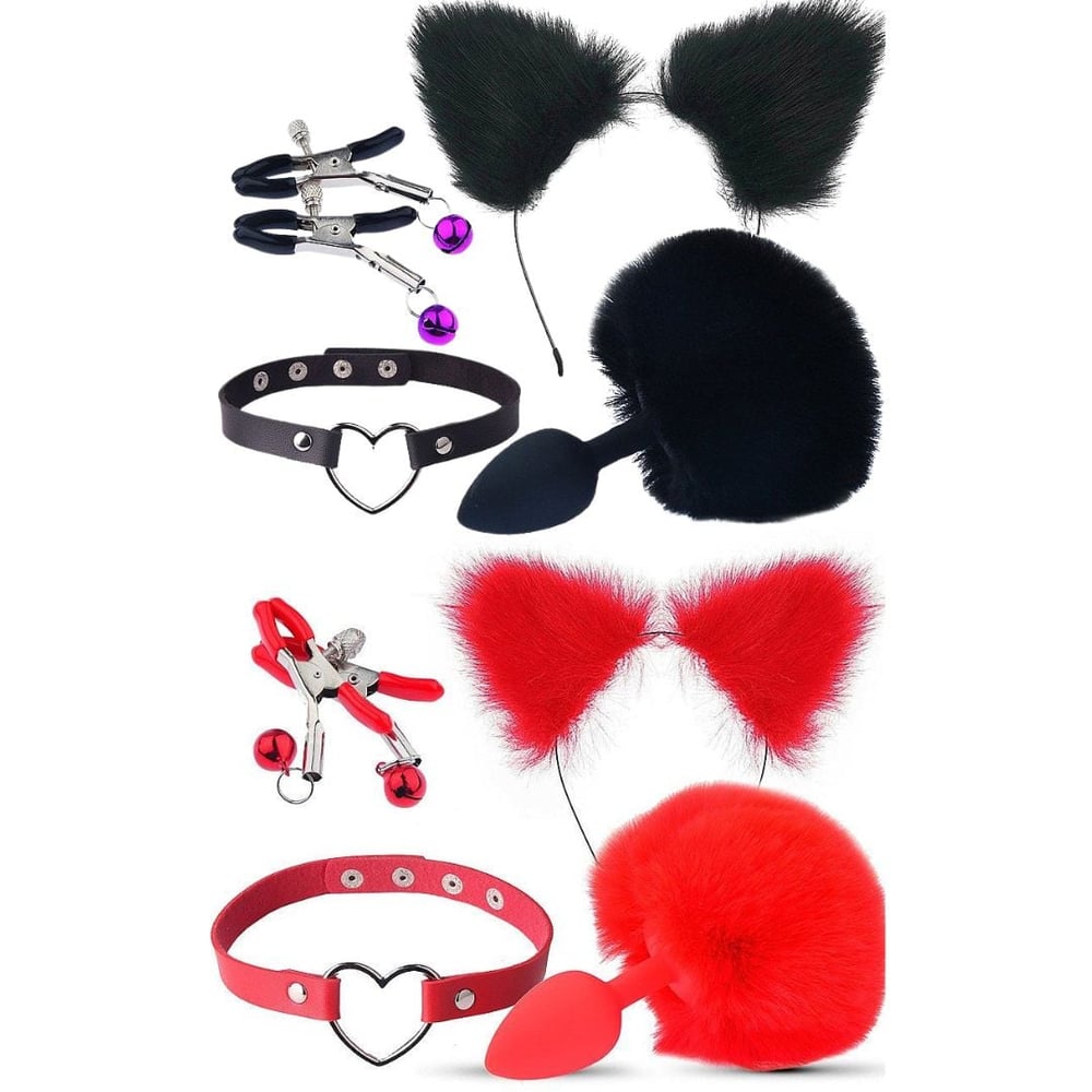 📍Contém: 1 tiara de pelúcia + 1 plug anal pompom + 1 prendedor de mamilo com sino + coleira de coração