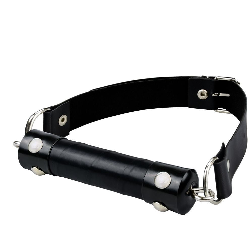 Mordaça tipo bastão de madeira revestido com couro sintético, rebites de metal e tiras e fivela para ajuste.