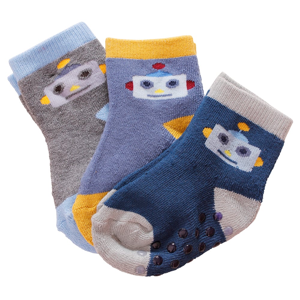 O kit de meias infantil é composto por 3 pares de meias com desenhos divertidos e cores neutras. Fabricadas em material macio, de toque suave e agradável aos pés das crianças. Além disso, possui antiderrapante que torna sua utilização segura. É uma meia que irá proteger os pezinhos da criança, mantê-los quentinhos e confortáveis.