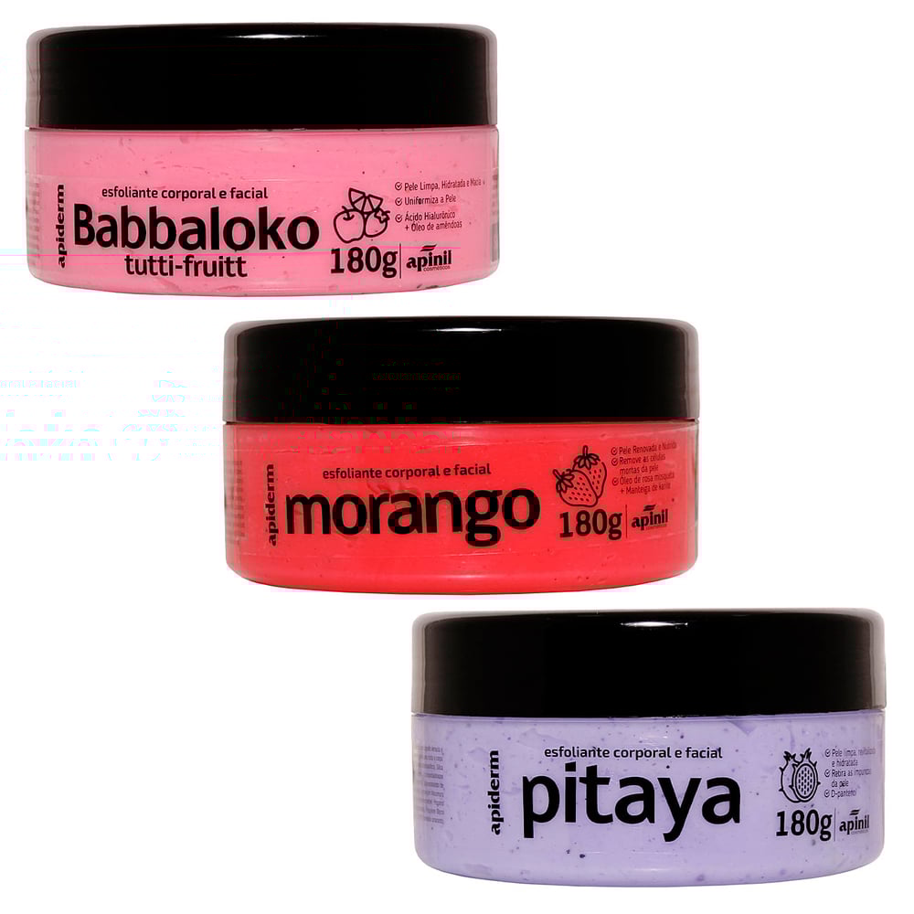 • Babbaloko (Tutti-fruitt) - com Ácido Hialurônico e Óleo de Amêndoas em sua composição, promove a remoção de células mortas de forma suave, deixando a pele limpa, hidratada e macia. Esses ingredientes retêm a água e ajudam a manter a elasticidade, tornando a pele mais firme e tonificada.