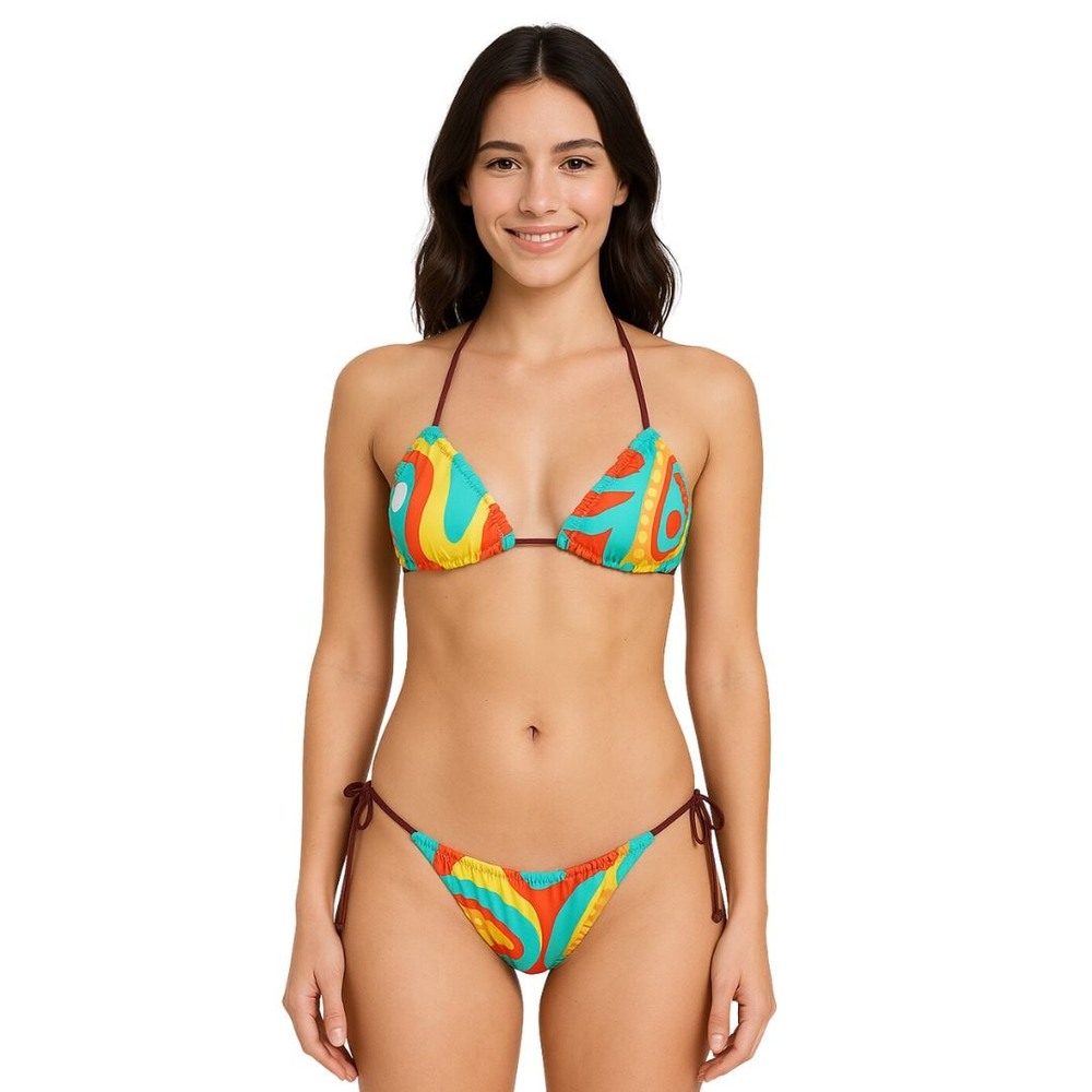 O top possui bojo (removível) estilo cortininha com busto triangular e babados na base. Com esta peça você consegue fazer uma série de combinações, além de ser um modelo super democrático que valoriza diferentes tipos de corpo. Já a calcinha é empina bumbum é um modelo de biquíni feminino caracterizado pelo design que valoriza e acentua o contorno dos glúteos. Ela possui uma costura central franzida na parte de trás, criando um efeito de “levantar” e dar volume ao bumbum. O biquíni tem um design diferenciado com cores vibrantes e detalhes encantadores, sendo uma ótima opção para curtir um dia de sol com muito estilo e conforto. 🤩