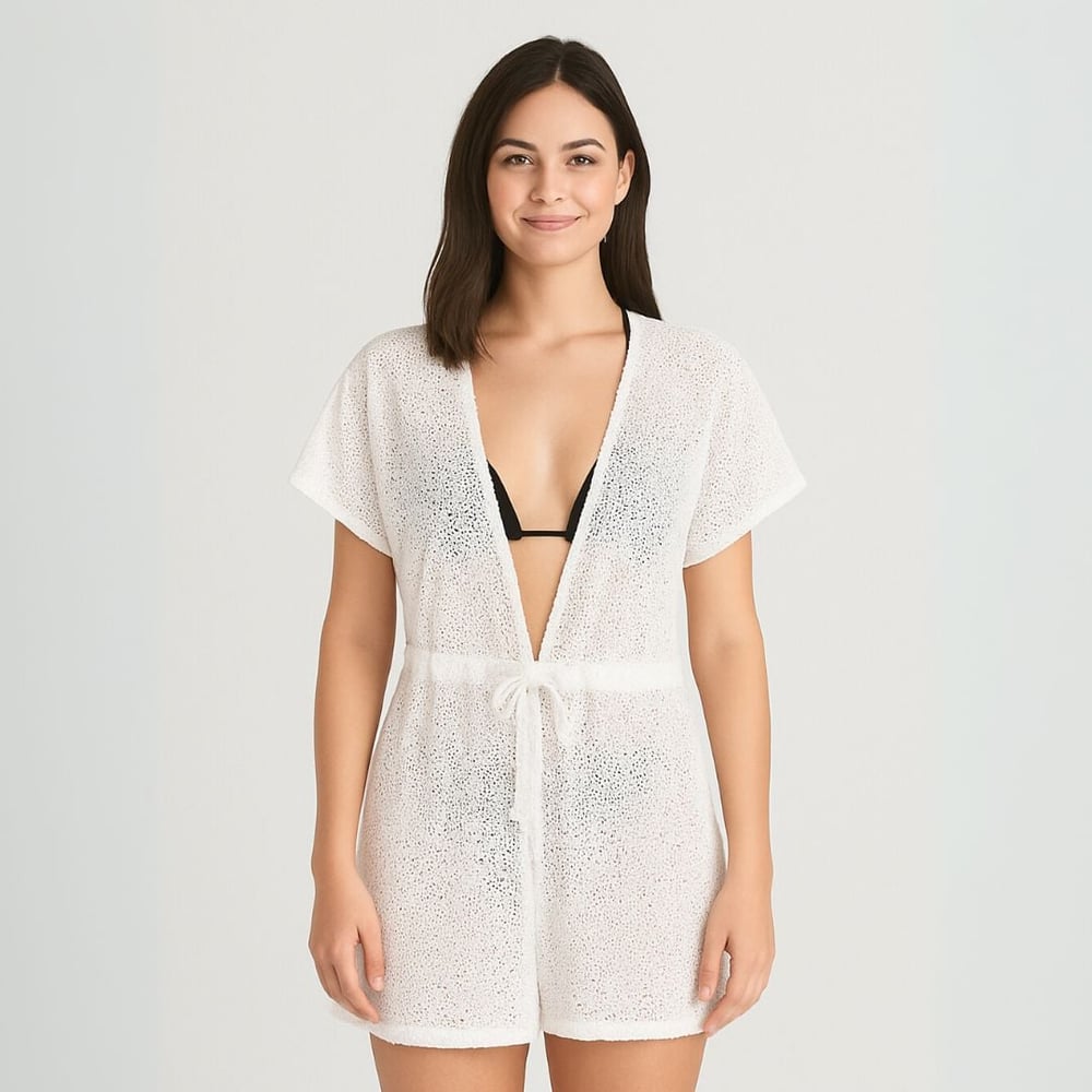 A saída de praia estilo kimôno arrastão é sinônimo de delicadeza e sofisticação. Seu design leve e fluido traz elegância instantânea ao look, proporcionando um visual refinado que vai muito além da praia. Confeccionada em renda estilo arrastão de qualidade, a peça combina transparência sutil e acabamento impecável, garantindo charme e conforto nos dias ensolarados. O toque macio do tecido e o caimento perfeito reforçam o cuidado e a excelência da marca. 🌞😁