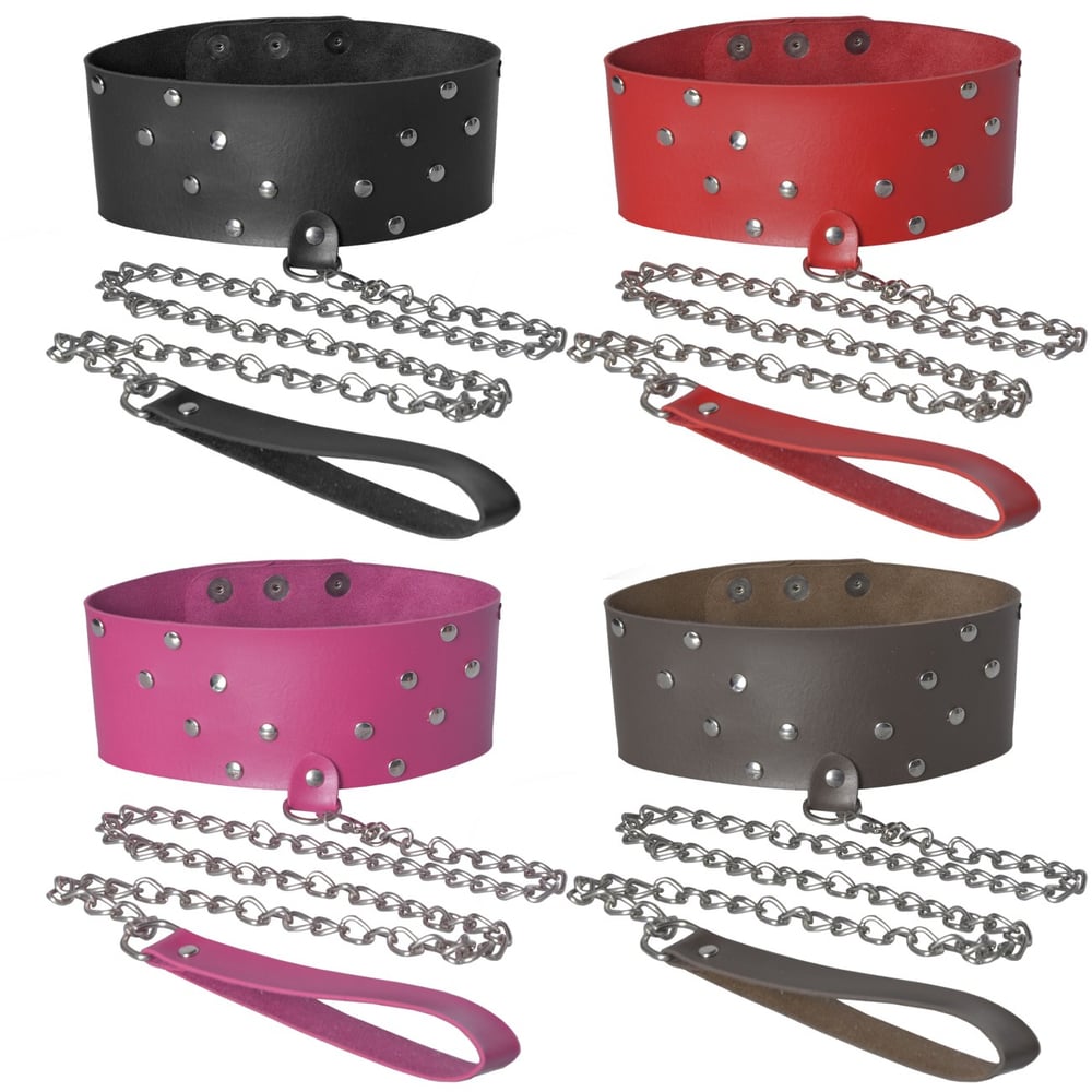 A "Coleira Scandal" da Dominatrix é confeccionada em montana, material semelhante o couro, possui detalhes de rebite e botão de pressão no fechamento, além da guia em corrente de aluminio.