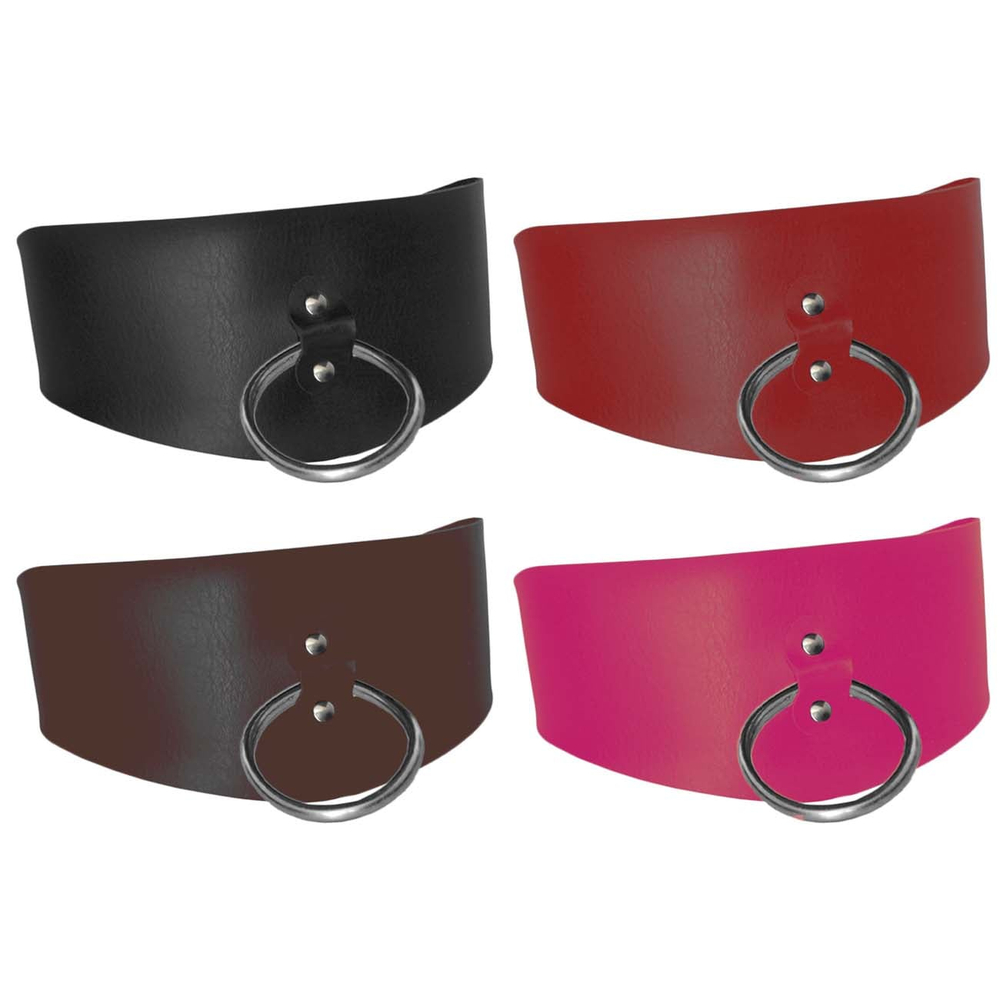 A "Coleira Rainha do Sado" da Dominatrix é confeccionada em montana, material semelhante ao couro, possui fechamento de fivela e argola de metal como puxador.